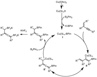 Organoboron compounds have been recognized as highly versatile reagents in organic synthesis [1-5]. They are not only widely applied in Suzuki−Miyaura couplings [6,7] and Petasis reaction [8] for the construction of C–C bond as essential carbon nucleophiles, but can be easily oxidized by alkaline peroxides to afford sp3-hybridized alkanols. Moreover, it is found that the boron atom also plays a vital role in design of the approved drugs and drug candidates [9,10], such as tavaborole [11], crisaborole [12], ixazomib [13], vaborbactam [14], and bortezomib [15]. Because of their reliable stability, low toxicity, moderate reactivities, and easy-to-handle properties, bis(boronate) compounds, such as bis(pinacolato)diboron (B2pin2), are expected to be very useful synthetic organoboron reagents for concise synthesis of complex borylated molecules [16-24]. These bis(boronate) compounds have been particularly used in the synthesis of various aryl and alkenylboron compounds due to their highly importance and much effort has been devoted to the formation of C-B bonds with borylmetal (M-B) species [25-27] serving as the key intermediates [28-32].