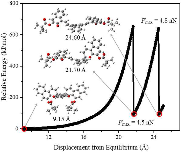 | Fig. 1. CoGEF calculation (B3LYP/6–31G*) performed on truncated models of ester functionalized An-BNP, predicting the dual ring opening of both NP units upon mechanical elongation. Computed structures are shown that correspond to the force-free geometry and the product immediately after the ring-opening reactions. | |
