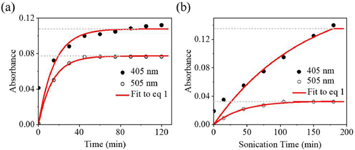 | Fig. 3. Evaluation of force-dependent mechanochromism of the An-BNP mechanophore. Representative kinetic plots for (a) PMA-An-BNP-PMA140 and (b) PMA-An-BNP-PMA68, demonstrating the determination of steady-state absorbance values. Absorbance at 405 and 505 nm were recorded for each polymer during ultrasound-induced mechanical activation and fitted to Eq. 1. | |