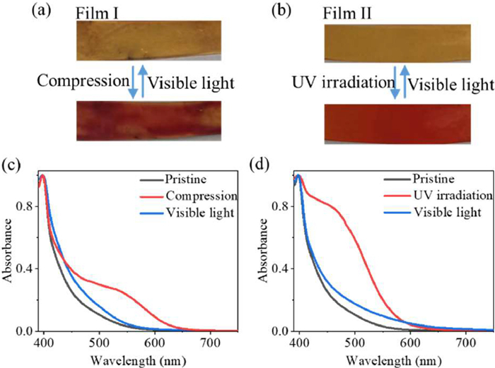 Lastly, we were interested to determine if the colored MC dyes in this bis-NPs system could be generated in bulk state. When the film was subjected to mild compression of ca. 50 MPa for 1 min, a distinct orange-red color was observed (Film I, Fig. 4a). The mechanically induced color was appreciable, which could be well reserved for more than 1 months in darkness. UV–vis absorption spectrum of the activated film showed the appearance of two new absorption bands at ca. 480 and 520 nm, assignable to the open-close and open-open forms of bis-NPs, respectively, and displaying bathochromic shifts to those in solution states (Fig. 4c). On the other hand, irradiation of the elastomeric cross-An-BNP-PMA with UV light (λ = 365 nm, 10 s) produced an orange film (Film Ⅱ, Fig. 4b), which was reasonably stable and could be faded rapidly with visible light exposure. The new absorption peak of the photo-activated Film Ⅱ at 480 nm was more significant (Fig. 4d), which was in contrast to that of Film Ⅰ dominated with the longer wavelength band. The different coloration of the two activated films was in consistent with the experimental results in solution, and indicated that the concentration of MC and bis-MC species in bulk state could be tuned by different kinds and magnitude of stimuli.
