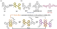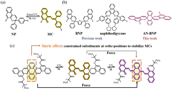 Naphthopyrans (NPs) are typical chromogenic switches. Their C—O bonds are photoactivable. When embedded in a linear polymer chain, they can be converted to mechanophores which can be activated into highly colored, ring-opening merocyanine isomers (MC) under force [42-47]. Ring closure color-fading reactions are attained under visible light or thermal reversion (Scheme 1a). The photochromic and mechanochromic behaviors of the NP probes enable the straightforward visualization of encoded information, stress and/or strain in materials. Due to the easy synthetic accessibility and tunable spectrokinetic properties of NPs, diverse NP derivatives and their polymers have been developed nowadays. In particular, Robb and co-workers have successfully demonstrated that synergistic coupling of two NP units into one bis-mechanophore (BNP, naphthodipyrans in Scheme 1b) is a powerful strategy to achieve multicolor mechano- and photochromic properties not observed with the corresponding single NP moiety [15, 38]. However, so far, the versatility of bis-mechanophore design for advanced optical molecular systems and the fundamental insights into the corresponding mechano-reactivity are not enough.