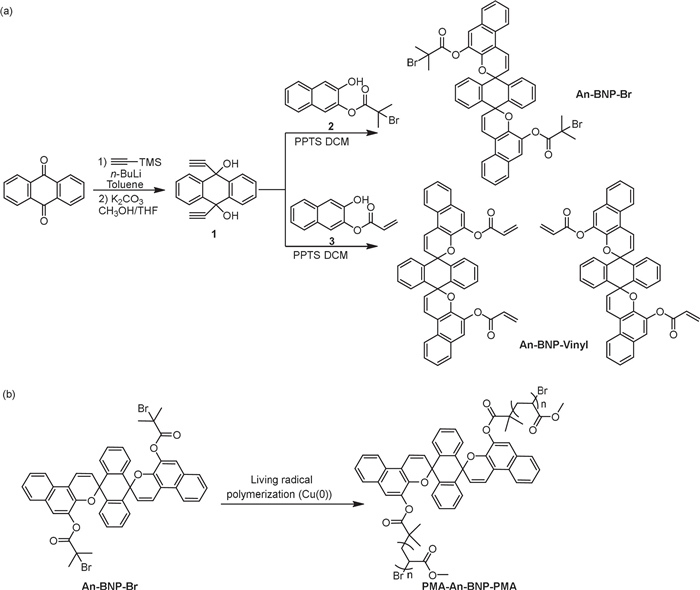 | Scheme 2. (a) Synthesis of polymerizable An-BNPs (An-BNP-Br and An-BNP-Vinyl); (b) An-BNP-Br was used to initiate a living radical polymerization to give PMA-An-BNP-PMA. | |