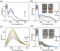 | Fig. 4. (a, b) Photographs and (c, d) UV–vis absorption spectra of a mechanochemically (a, c) and photochemically (b, d) activated cross-An-BNP-PMA film. Photographs were acquired immediately after activation of force-dependent mechanochromism of the An-BNP mechanophore. | |