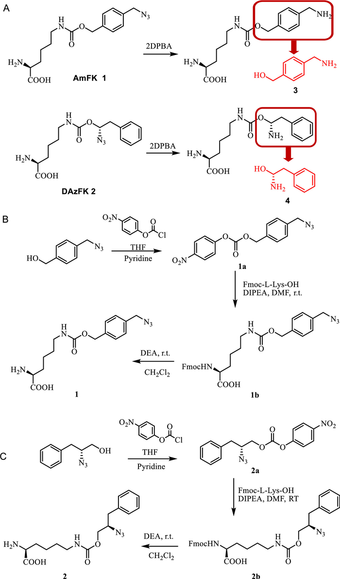 | Fig. 1. (A) Synthesis of N6-(((4-(azidomethyl)benzyl)oxy)carbonyl)-L-lysine (AmFK, 1). (B) Synthesis of N6-(((R)−2-azido-3-phenylpropoxy)carbonyl)-L-lysine (DAzFK, 2). (C) Reduction of AmFK, guest motif of AmFK: amino methyl)benzyl alcohol 3, Reduction of DAzFK, guest motif of DAzFK: D-phenylalanine alcohol 4. | |