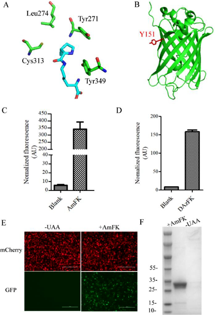 A large number of structurally diverse UAAs have been genetically encoded in response to an amber codon introduced into a gene of interest using engineered pyrrolysyl tRNA synthetase (PylRS)/tRNACUA pairs from Methanosarcina species [20]. By utilizing PylRS/tRNACUA pairs and their evolved variants, UAAs have now been incorporated site-specifically into bacteria [21], Saccharomyces cerevisiae [14], mammalian cells [22] and living organisms [23]. Screening of a PylRS library designed based on the crystal structure of M.maize PylRS pyrrolysyl-AMP (PDB code 2ZIM, Fig. 2A) identified two mutations, named ASFRS (ASFRS: L274A/C313S/Y349F) and GAVRS (GAVRS: Y271G/L274A/C313V/Y349F) for the insertion of these two non-canonical amino acids respectively. Next, sfGFP-Y151TAG was selected as a model protein to test incorporation efficiency (Fig. 2B). BL21(DE3) cells containing the pET22B-T5-sfGFP-Y151TAG and ASFRS or GAVRS were cultured in the presence or absence of 1 mmol/L ncAAs with the corresponding synthetases. As shown in Figs. 2C and D, a 70 folds and 20 folds fluorescence increase can observed in the presence of the AmFK and DAzFK, respectively, suggesting an amber codon suppression of both ncAAs. As shown in Fig. 2E, the full-length GFP can only be observed in the presence of 1 mmol/L AmFK. Additionally, the incorporation of the AmFK in mammalian cells was also evaluated by co-transfection of pcmv-ASFRS with pcDNA3.1-mCherry-EGFP-39TAG (Fig. 2F).