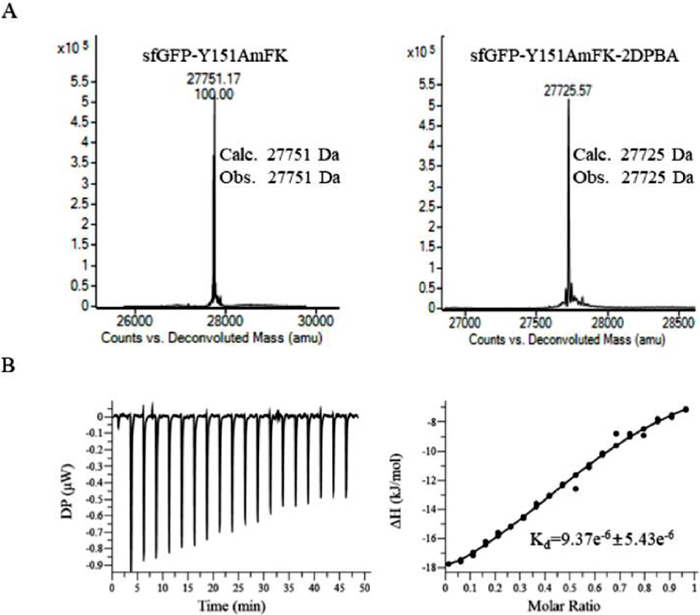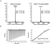 | Fig. 3. (A) Treatment of purified sfGFP-Y151AmFK with 2DPBA results in quantitative reduction of the azide group. (B) ITC titration of CB7 into sfGFP-Y151AmFK-After reduction, sfGFP-Y151AmFK-After reduction was at a 50 µmol/L concentration in 10 mmol/L phosphate buffer and CB[7] was at a 250 µmol/L concentration in 10 mmol/L phosphate buffer. The analyses were run at 25 ℃. | |