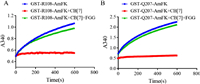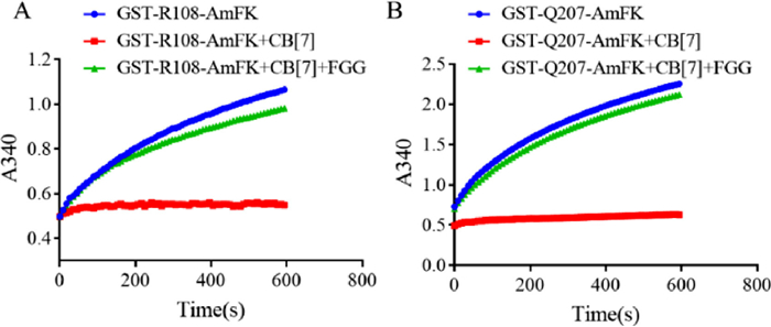 | Fig. 4. Assay of enzymatic activity of the GST-Q207AmFK mutant (A) and R108AmFK mutant (B) (pH 6.5, phosphate-buffered saline, 25 ℃, [GST-R108-AmFK] = 3 µmol/L, [GST-Q207-AmFK] = 3 µmol/L, [CB[7]] = 1 mmol/L, [FGG] = 1.2 mmol/L, [GSH] = 1 mmol/L, [CDNB] = 1 mmol/L (CDNB = 1–chloro-2,4-dinitrobenzene). | |