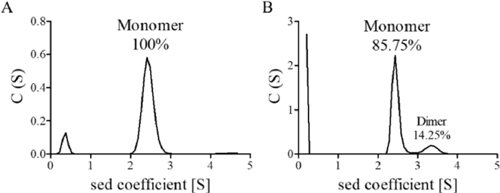 | Fig. 5. AUC assay of enzymatic activity of the sfGFP-AmFK protein dimerisation (pH 7.0, phosphate-buffered saline, 25 ℃). (A) 1 µmol/L sfGFP-AmFK-AR; (B) 10 µmol/L sfGFP-AmFK-AR and 10 µmol/L CB[8]. AR: after reduction. | |