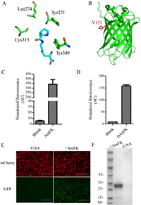 | Fig. 2. (A) X-ray crystal structure of the MmPylRS complex with pyrrolysyl-AMP. The structure is from PDB entry 2ZIM. (B) Crystal structure of sfGFP (green) (PDB ID: 2b3p). Sites selected for incorporation of non-canonical amino acids are indicated in red. (C) AmFK incorporation with ASFRS. (D) DAzFK incorporation with GAVRS. (E) Images of EGFP expressed in the presence of AmFK in mammalian cells. (F) GFP expressed in the presence and absence of 1 mmol/L AmFK with ASFRS. | |