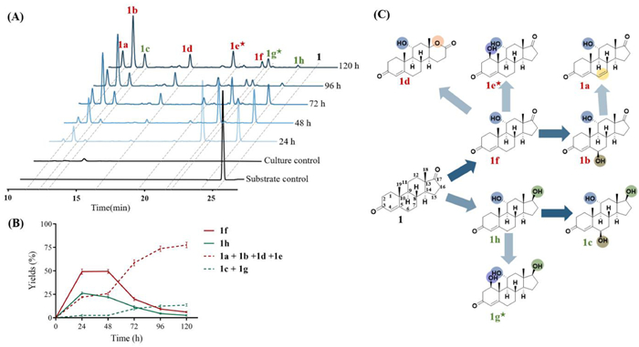 | Fig. 1. Biotransformation of 4-AD (1) by B. bassiana. (A, B) Time course profile for the biotransformation of 1 by B. bassiana. Culture control consisted of fermentation blanks in which microorganisms were grown under identical conditions but without the substrate. Substrate control consisted of sterile medium containing the same amount of substrate and were incubated under the same conditions. (C) A proposed biotransformation pathway of 1 by B. bassiana. The color depth of arrowhead represents the conversion rate, the darker the color, the higher the conversion rate. ★ New compounds. | |