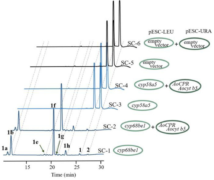 | Fig. 3. HPLC results of in vivo functional verification of two CYPs in recombinant S. cerevisiae. | |