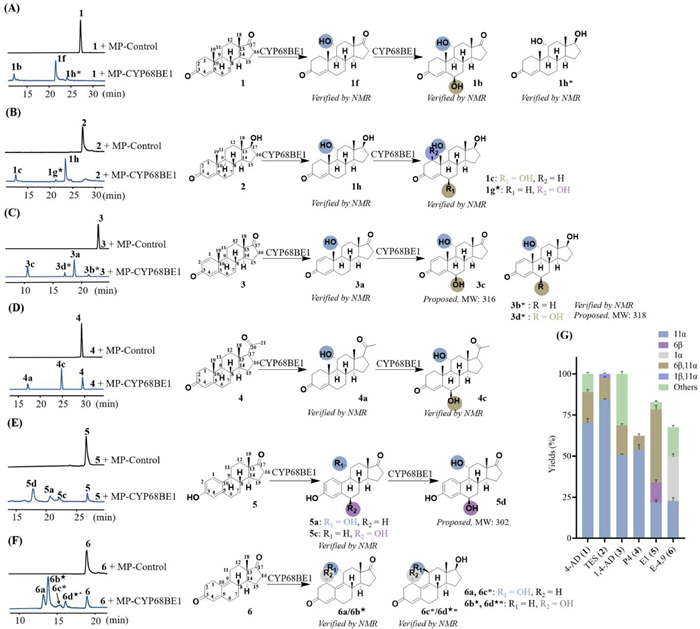 | Fig. 4. Results of catalytic promiscuity tests of CYP68BE1. (A–F) In vitro functional verification and conversion route of CYP68BE1 to substrates 1–6. (G) Conversion products distribution of 1–6 from CYP68BE1 in vitro assay. MP-Control refers to the microsome protein of SC-5, and MP-CYP68BE1 refers to the microsome protein of SC-1. ★ New compounds. * Hydroxylated steroids products in which C17 keto has been reduced. Products 3c, 3d and 5d were not determined due to separation problems, but their structures were deduced to be hydroxylated products, considering their molecular weights. | |