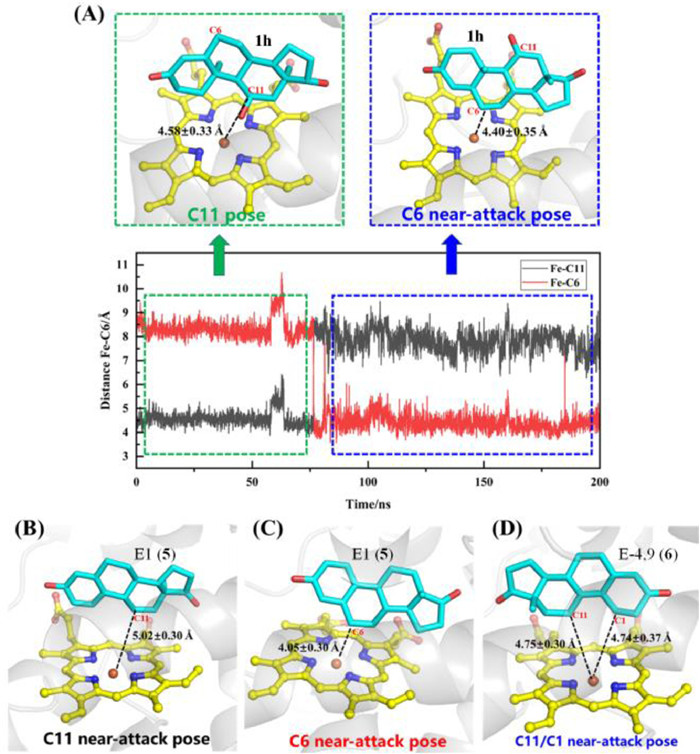 To systematically explain the mechanisms of the production of different hydroxylated products above, we used Alphafold2 to perform three-dimensional structure prediction, and molecular dynamics (MD) simulation to explore the molecular basis for regio-selectivity of CYP68BE1 to different steroid substrates (Figs. S17–S19 in Supporting information). The 11α-hydroxylation product (1h) of 2 was docked into the pocket of CYP68BE1 with C11 pointing to the ferrous of heme. Then 200 ns MD simulations were performed and the evolution of distances of Fe-C11 and Fe-C6 was recorded. The distance of Fe-C11 approximately maintained within 5 Å (4.58 ± 0.33 Å) from 0 to 75 ns, followed by the distance of Fe-C11 increased immediately with Fe-C6 distance decreased to about 5 Å (4.58 ± 0.33 Å) (Fig. 5A). The above-mentioned change of distance held the possibility that 1h, as the intermediate of modification reaction to 2, could flip to the C6 near-attack pose in favor of the next modification of C6-hydroxylation. However, we could not exclude another possibility that the intermediate 1h firstly dissociated from the pocket and then bound into the pocket again with C6 near-attack pose.