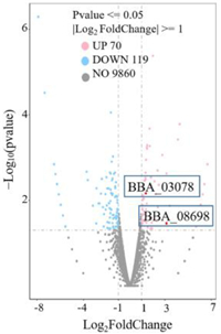 | Fig. 2. Volcano map of differential genes. Points filled with light-pink or light-blue represent gene expressions with increased or decreased abundance (|log2 Fold change| ≥ 1) in response to 4-AD induction, while gray points represent genes with no differences in the expression. Two CYP genes are colored as red, respectively. | |