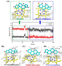 | Fig. 5. MD simulations of CYP68BE1 in the reaction with different substrates. (A) The evolution of distance over simulation times of compound 1h. (B) Representative C11 near-attack pose generated by cluster analysis from MD simulations of 5. (C) Representative C6 near-attack pose generated by cluster analysis from MD simulations of 5. (D) Representative C11/C1 near-attack pose from MD simulations of 6. | |