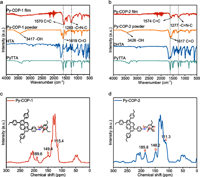 | Fig. 1. FT-IR spectra of (a) Py-COP-1 and (b) Py-COP-2. 13C solid-state NMR spectra of (c) Py-COP-1 and (d) Py-COP-2. | |