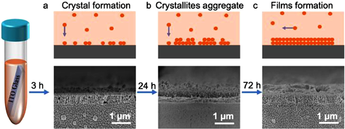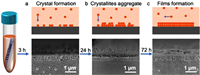 | Fig. 2. Cross-sectional SEM images of Py-COP-2 thin films grown on ITO substrates after (a) 3 h, (b) 24 h, and (c) 72 h. | |