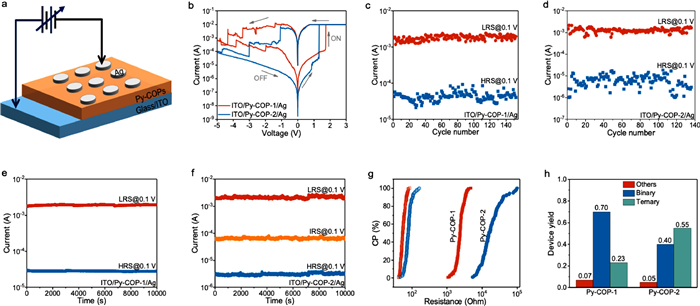 | Fig. 3. (a) The 3D schematic diagram of ITO/Py-COPs/Ag devices. (b) I-V characteristics of the ITO/Py-COP-1/Ag and ITO/Py-COP-2/Ag memory devices. (c, d) Cycle endurance of the ITO/Py-COP-1/Ag and ITO/Py-COP-2/Ag memory devices showing 152 and 136 cycles, respectively. (e, f) Retention time of ITO/Py-COP-1/Ag and ITO/Py-COP-2/Ag memory device at "OFF" and "ON" states under a constant "read" voltage of +0.1 V. (g) The resistance values cumulative probability of Py-COP-1- and Py-COP-2-based devices. (h) The ternary device yield distributions of Py-COP-1- and Py-COP-2-based devices. | |