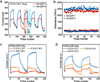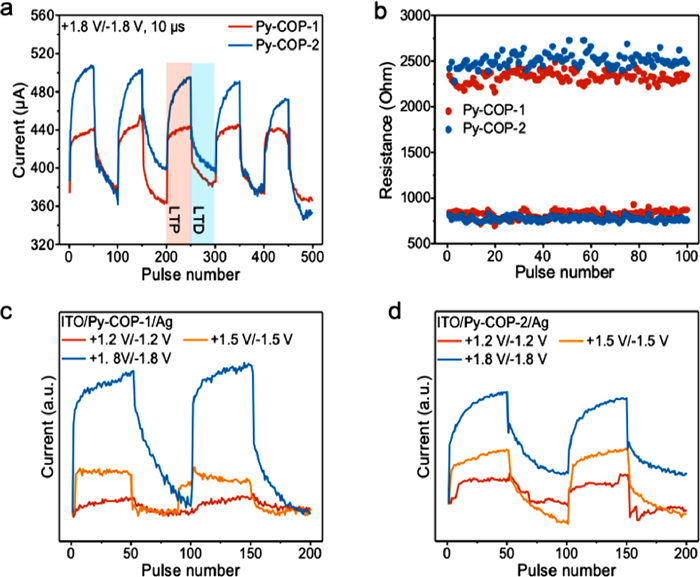 | Fig. 4. (a) LTP/LTD behaviors of the Py-COPs-based devices under set pulses (+1.8 V/10 µs) and reset pulses (−1.8 V/10 µs). (b) The endurance characteristics of the Py-COPs-based devices under AC pulse mode. (c, d) The LTP/LTD behaviors of the Py-COPs-based devices under different pulse heights. | |