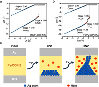 | Fig. 5. Log-log plot of the I-V curves measured of ITO/Py-COPs/Ag devices under positive bias: (a) ITO/Py-COP-1/Ag, (b) ITO/Py-COP-2/Ag. (c) The illustration of the initial, ON1, and ON2 states of the Py-COP-2-based device. | |