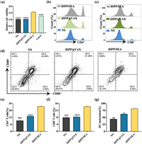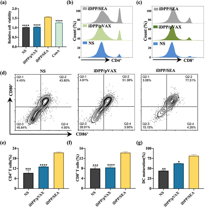 | Fig. 2. SEA expression in B16-F10 induces lymphocytes activation and DCs maturation in vitro. (a) Cell viability of splenic lymphocytes cells that co-cultured with B16-F10 cells of NS, iDPP/pVAX, iDPP/SEA or concanavalin A group. (b, c, e, f) Detection of CD4+/CD8+ splenic lymphocytes cells that co-cultured with B16-F10 cells of NS, iDPP/pVAX, iDPP/SEA (n = 3). (d, g) DCs maturation when incubation with B16-F10 cells of NS, iDPP/pVAX, iDPP/SEA group (n = 3). P < 0.05, **P < 0.01, ***P < 0.001, ****P < 0.0001. Data are mean ± SD. | |