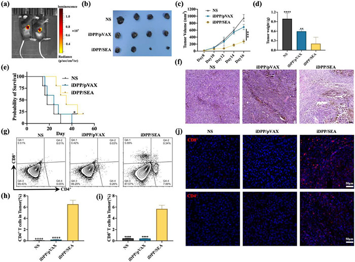 The anti-tumor efficiency of iDPP/SEA nanocomplexes in vivo was evaluated using the B16-F10 subcutaneous melanoma model. All the animal experiments were approved by the Animal Care Committee of Sichuan University. The plasmid pGL6 was utilized as a reporter to assess the tumor targeting capabilities of the iDPP delivery system. After tail vein injection, the iDPP/pGL6 nanocomplexes could concentrate to the melanoma tissue and express firefly luciferase, demonstrating that iDPP delivery system has good targeting ability in vivo (Fig. 3a). In the B16-F10 subcutaneous melanoma model, the growth rate of tumor volume decreased significantly in iDPP/SEA group compared to the NS and iDPP/pVAX (Figs. 3b and c). After measuring the tumor weight of each group, the tumor inhibition rate of each group was calculated. The tumor weights were 0.99 ± 0.19 g in NS group, 0.61 ± 0.11 g in iDPP/pVAX group, and 0.21 ± 0.18 g in iDPP/SEA group (Fig. 3d). The tumor inhibition rate of iDPP/SEA gene preparation was about 68%, which was significantly higher than that of iDPP/pVAX group. The mice treated with iDPP/SEA nanocomplexes also survived longer than other groups (Fig. 3e). Furthermore, hematoxylin-eosin (H&E) staining showed that the density of tumor cells in melanoma tissues of iDPP/SEA group was significantly lower than that in other groups (Fig. 3f). In addition, a high number of inflammatory cells were observed in melanoma tissue in the iDPP/SEA group.