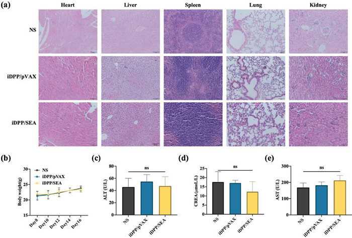 The safety of the iDPP/SEA formulation was examined from several perspectives in vivo. We did not observe obvious pathological changes, such as edema, inflammation, degeneration, or necrosis, in heart, liver, spleen, lung, and kidney of each treatment group through H&E staining (Fig. 4a). Furthermore, the body weight of mice treated with iDPP/SEA nanocomplexes was not substantially different from that of NS (Fig. 4b) after treatment. The biochemical markers, such as alanine aminotransferase (ALT), creatinine (CREA), and aspartate aminotransferase (AST) of iDPP/SEA group were not significantly different from those in NS group (Figs. 4c–e). As all mentioned above, the intravenous injection of iDPP/SEA nanocomplexes did not exhibit obvious side effect in vivo.