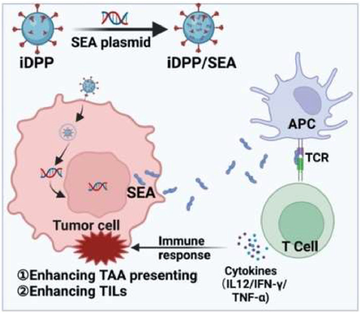 Superantigens have potential in tumor therapy as an immunoadjuvant [23]. In recent research, superantigen was used to enhance chimeric antigen receptor T cell (CAR-T) potency and boost CAR-T efficacy against solid tumors [31]. A lot of work has been carried out to enhance the tumor targeting of superantigens to reduce the side effects. Yousefi et al. developed a method of fusing the third loop of transforming growth factor α (TGFαL3) with staphylococcal enterotoxin type B (SEB) to effectively inhibit the growth of breast tumors [32]. Golob-Urbanc et al. designed a superantigen fusion proteins which split a superantigen into two fragments, individually inactive, until both fragments came into close proximity and reassembled into a biologically active form capable of activating T cell response [33]. Distinguished from strategies like tumor-specific antibody conjugates, tumor-targeting nanoparticle iDPP was used to deliver SEA in this work. It could express SEA at tumor sites, trigger T cells infiltration which shows great potential to enhance lymphocytes infiltration at tumor site, which might change “cold tumor” to “hot tumor”.