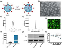 | Fig. 1. iDPP/SEA nanocomplexes mediate SEA expression in B16-F10 cells. (a) Scheme of the assembly of iDPP/SEA nanocomplexes including iRGD, mPEG2000-PLA2000, DOTAP and pVAX-SEA plasmids. (b) Transmission electron microscopic image of iDPP/SEA nanocomplexes. Scale bar: 50 nm. (c) Size distribution of iDPP/SEA nanocomplexes. (d) Zeta potential of iDPP/SEA nanocomplexes. (e) Fluorescent image of B16-F10 cells transfected with iDPP/GFP nanocomplexes. Scale bar: 200 µm. (f) The mRNA expression level of SEA in B16-F10 cells transfected with iDPP/pVAX nanocomplexes, iDPP/SEA nanocomplexes. ****P < 0.0001. (g) The protein expression of SEA in NS group, iDPP/pVAX group, iDPP/SEA group analyzed by Western blot. (h) Cell viability of B16-F10 cells treated with iDPP/pVAX nanocomplexes, iDPP/SEA nanocomplexes (MTT assay, n = 5). Data are mean ± standard deviation (SD). | |