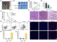 | Fig. 3. Antitumor activity of iDPP/SEA by intravenous injection in vivo. (a) In vivo imaging of luciferase expression in B16-F10 cells-bearing mice treated with iDPP/pGL6 at 72 h post-injection. (b) Tumor masses. (c) Tumor volume (n = 7). (d) Tumor weights in each treatment group (n = 7). (e) Survival analysis of mice after 50 d of initial tumor cell inoculation (n = 5). (f) Representative histological sections of tumors stained with H&E. Scale bar: 50 µm. (g) The numbers of CD8+ T cells and CD4+ T cells in tumor tissues were examined by flow cytometry. (h, i) Statistics of CD8+ T cells and CD4+ T cells ratio of different groups (n = 3). (j) Fluorescence microscopic images of CD8+ T cells and CD4+ T cells in tumor tissues. Scale bar: 50 µm (n = 3). P < 0.05, **P < 0.01, ***P < 0.001, ****P < 0.0001. Data are mean ± SD. | |