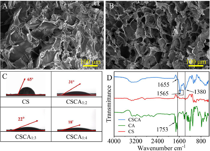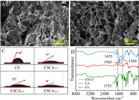 | Fig. 1. SEM micrographs of (A) CS and (B) CSCA1:4. (C) Contact angle data of CS, CSCA1:2, CSCA1:3, CSCA1:4. (D) FI-IR spectra of CA, CS and CSCA. | |