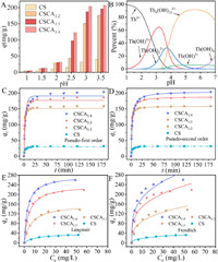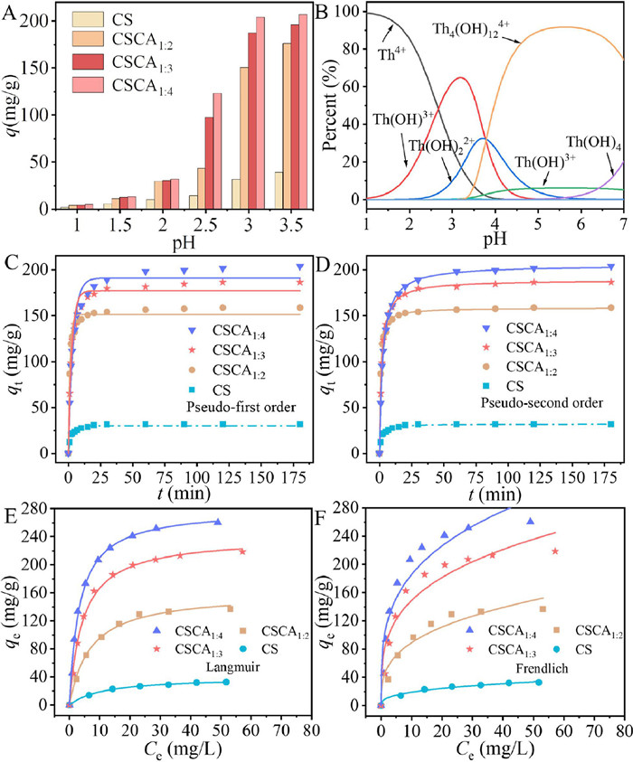 | Fig. 2. (A) The effect of pH on the adsorption of Th(Ⅳ) onto CS, CSCA1:2, CSCA1:3 and CSCA1:4 (m = 5 mg, C0 = 50 mg/L, t = 180 min, T = 298.15 K). (B) Distribution of Th(Ⅳ) species at different pH values with a total concentration of 50 mg/L. Adsorption kinetics of Th(Ⅳ) onto different samples and fitting curves of the pseudo-first order dynamic equation (C) and the pseudo-second order dynamic (D) (pH =3.0, m = 5 mg, V = 25 mL, CTh = 50 mg/L, T = 298.15 K). (E) Langmuir and (F) Freundlich isotherm models for adsorption of Th(Ⅳ) onto different samples (pH = 3.0, m = 5 mg, V = 25 mL, CTh = 50 mg/L, T = 298.15 K). | |