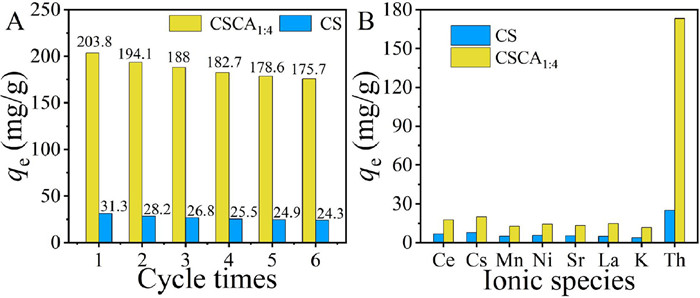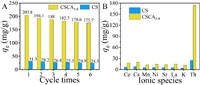 | Fig. 3. (A) Th(Ⅳ) adsorption capacities of CS and CSCA during the 6 cycles (pH = 3.0, C0 = 50 mg/L, T = 298.15 K), (B) Th(Ⅳ) adsorption capacities of CS and CSCA with co-existed ions (pH = 3.0, Cother ions = 0.5 mol/L, T = 298.15 K). | |