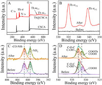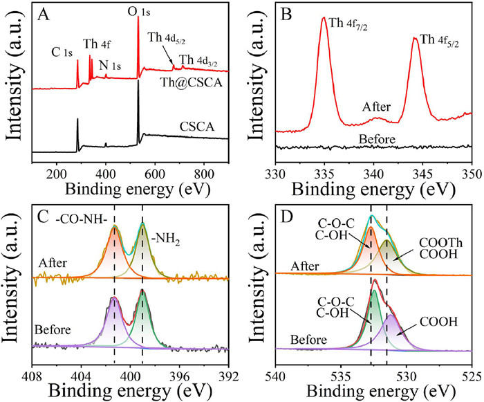 | Fig. 4. XPS spectra of CSCA (A) and high-resolution XPS spectra of Th 4f (B), N 1s (C), and O 1s (D) before and after Th(Ⅳ) adsorption. | |