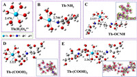 | Fig. 5. The optimized configurations of (A) thorium hexahydrate [Th(H2O)6]4+, (B) 1:1 ratio of Th(Ⅳ) with -NH2 ligand on amino group, (C) 1:1 ratio of Th(Ⅳ) with C=O ligand on amide group, (D) 1:2 ratio of Th(Ⅳ) with C=O ligands on the same CSCA chain, and (E) 1:4 ratio of Th(Ⅳ) with C=O ligands on two distinct CSCA chains. The deformation charge density (binding region between Th(Ⅳ) and synthetic adsorbent) was shown in blue dotted box. | |