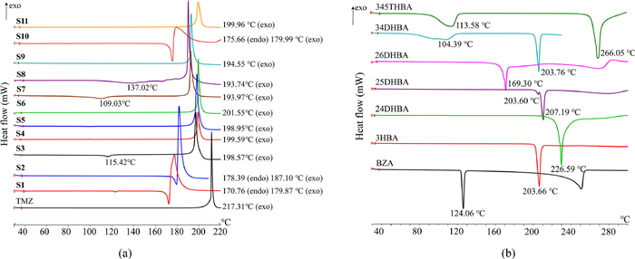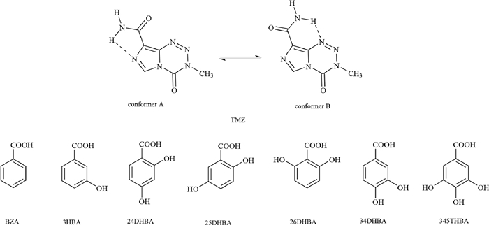 TMZ cocrystal powders were prepared by the slurry method. Taking S1 as an example, TMZ and BZA in a ratio of 1:1 were suspended in ethanol solution. The suspension was agitated at 400 r/min for 24 h at 25 ℃, followed by filtration of the agglomerates. The powder samples were dried in a vacuum drying oven (DZF-6020) at 40 ℃ for 6 h. The same steps were applied to prepare other TMZ-hydroxybenzoic acid cocrystals in a definite ratio using corresponding suitable solvents. Unfortunately, the cocrystal powders of S12 were not obtained despite many attempts.