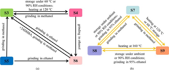 | Fig. 6. Schematic diagram of phase transformations of (a) TMZ-24DHBA and (b) TMZ-25DHBA cocrystal forms. | |