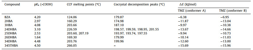 Table 1 pKa values, melting points of all CCFs, decomposition peaks of corresponding cocrystals, and the difference in the interaction site pairing energies (ΔE) values of isolated monomers and that of cocrystals. |