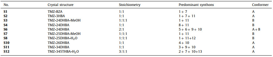 Table 3 Predominant synthons, stoichiometry, and conformers of TMZ in the crystal structures. |