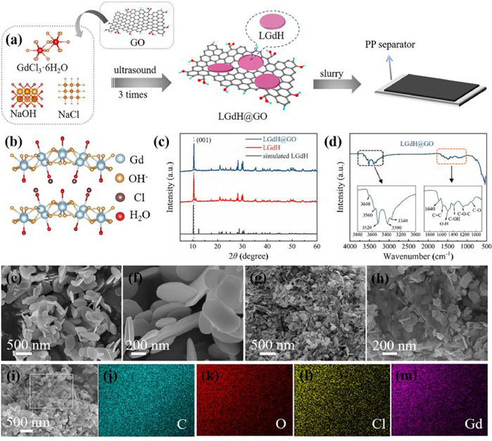 | Fig. 1. (a) Schematic illustration for the synthesis of LGdH and LGdH@GO. (b) Crystal structure of [Gd2(OH)5(H2O)n]Cl. Gd, Cl and OH– species are depicted in blue, orange and brown. (c) XRD patterns of simulated LGdH and synthesized LGdH and LGdH@GO. (d) FTIR spectrum of LGdH@GO. The insets are the FTIR spectra of LGdH@GO at wavenumber from 3000 cm−1 to 3800 cm−1 (left) and 900 cm−1 to 1900 cm−1 (right). SEM images of (e, f) LGdH and (g, h) LGdH@GO. (i) SEM image and the corresponding elements mappings of (j) C, (k) O, (l) Cl and (m) Gd. | |