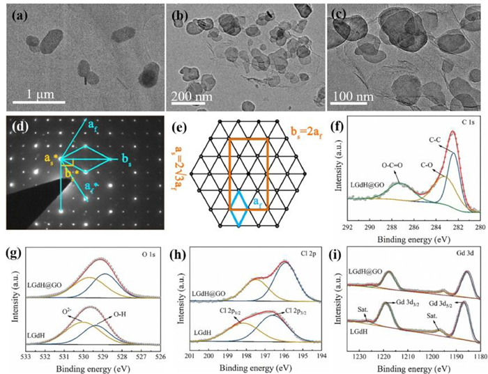| Fig. 2. TEM images of (a) LGdH and (b, c) LGdH@GO. (d) SAED pattern of LGdH. (e) The relationship between the fundamental cell and the rectangular supercell. af: axis of fundamental cell in the real place; as, bs: a and b axes of superlattice cell in the real place, respectively. Labels with asterisks corresponding to reciprocal axes. XPS spectra of (f) C 1s of LGdH@GO. (g) O 1s of LGdH and LGdH@GO. (h) Cl 2p of LGdH and LGdH@GO. (i) Gd 3d of LGdH and LGdH@GO. | |