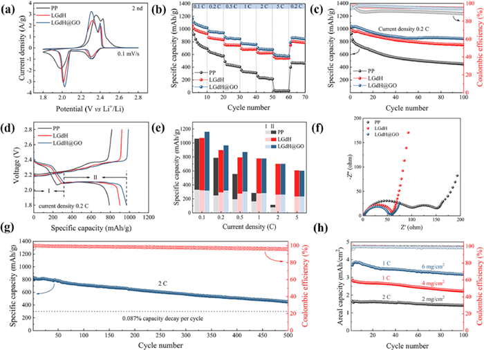The electrochemical performances of LGdH and LGdH@GO were investigated by assembling Li-S batteries with LGdH and LGdH@GO modified separators. The cyclic voltammetry (CV) curves of various separators are shown in Fig. 3a at a scan rate of 0.1 mV/s between 1.8 V and 2.8 V. LGdH and LGdH@GO modified separators showed two reduction peaks at about 2.31 and 2.02 V, corresponding to the reduction of elemental sulfur to long-chain LiPSs (Li2Sx, 4 ≤ x ≤ 8) and long-chain to short-chain LiPSs (Li2S/Li2S2), respectively. The oxidation peaks at about 2.31 and 2.40 V could be ascribed to the reversible processes. Additionally, the second reduction peaks of modified separators shifted toward higher potential and became much stronger, which indicates a lower polarization and better sulfur utilization. These CV results clearly imply that the LGdH containing functional interlayer support better electrochemical kinetics for LiPSs conversion. The rate performances of PP, LGdH and LGdH@GO modified separators are shown in Fig. 3b at varying current densities from 0.1 C to 5 C. The LGdH@GO modified separator displayed better specific capacities compared with PP and LGdH separators, with values of 1163.26, 968.32, 872.52, 779.33, 703.77 and 605.34 mAh/g at 0.1, 0.2, 0.5, 1, 2 and 5 C, respectively. This indicates that LGdH@GO composite could effectively hinder the "shuttle effect" of the LiPSs. The galvanostatic discharge/charge (GDC) profiles at various current densities (Fig. S4 in Supporting information) were also used to further confirm the rate performances. As shown in Fig. 3c, PP showed a specific capacity of 924.4 mAh/g initially, but only 48.8% capacity (451.4 mAh/g) was retained after 100 cycles. In contrast, the LGdH and LGdH@GO modified separators demonstrated 73.6% (751.4 mAh/g) and 81.5% (846.3 mAh/g) retention of capacity after 100 cycles. The GDC profiles of various separators (Fig. 3d) at the current density of 0.2 C displayed two typical discharge plateaus corresponding to the conversion of sulfur (S8) to long-chain LiPSs (Ⅰ) and long-chain LiPSs to short-chain LiPSs (Ⅱ), respectively. The specific capacities of all three separators faded with the increasing current density, due to the sluggish reduction kinetics of LiPSs. However, approximately 62% of discharge capacity was retained in the second plateau of LGdH, and LGdH@GO modified separators, even at a high current density of 5 C (Fig. 3e and Table S2 in Supporting information) [49]. The electrochemical impedance spectra (EIS) were also measured to further explore the electrochemical performances of the modified separators. The Nyquist plots of modified separators (Fig. 3f) were composed of a semicircle in the high frequency and a straight line in the low frequency, which were ascribed to charge transfer resistance (RCT) and ion diffusion resistance, respectively [9]. Notably, the PP separator showed much larger RCT with two semicircles in the high frequency because of its poor electronic conductivity. The RCT was the smallest for LGdH@GO modified separator due to the synergistic effect of LGdH nanoplates and graphene oxide. The commercialization of Li-S batteries requires long-term cycling stability and high areal capacity. The long-term cycling stability of LGdH@GO (Fig. 3g) with a sulfur loading of 2 mg/cm2 was measured at the current density of 2 C. It exhibited an initial specific capacity of 797.4 mAh/g at 2 C after one cycle of activation at 0.1 C. After 500 cycles, it maintained a considerable specific capacity of 449.6 mAh/g, accompanied by a high coulombic efficiency of 96%. The specific capacity retention was calculated as 56.4%, and the corresponding capacity decay rate of 0.087% per cycle, revealing an excellent cycling performance of the LGdH@GO modified separator. Its cycling performances at a current density of 1 C with higher sulfur loadings of 4 and 6 mg/cm2 was also tested (Fig. 3h). A high initial specific capacity of 2.85 and 3.69 mAh/cm2 was obtained with one cycle of activation at 0.2 C for samples with 4 and 6 mg cm2 of sulfur loadings, respectively, which retained areal capacities of 2.23 and 3.17 mAh/cm2 after 100 cycles at 1 C, indicating a promising potential in Li-S batteries applications.