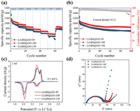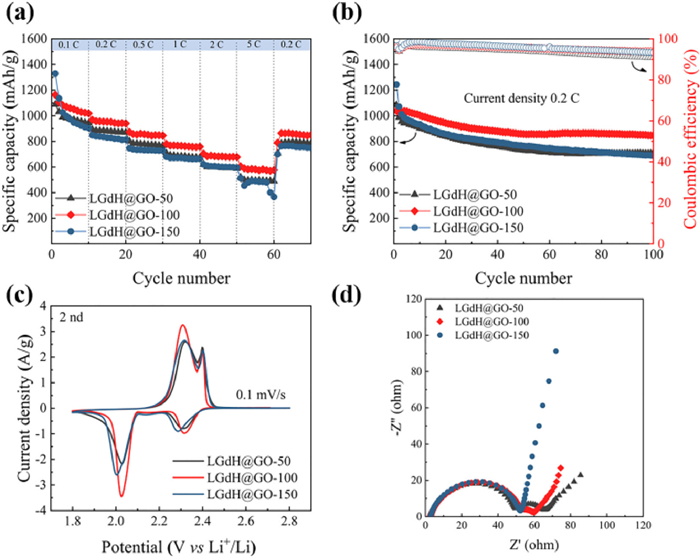 | Fig. 4. Electrochemical performances of LGdH@GO-50, LGdH@GO-100 and LGdH@GO-150. (a) Rate performances at various current density of Li-S batteries with various thicknesses. (b) Cycling performances of Li-S batteries with various thicknesses at 0.2 C. (c) CV curves of Li-S batteries with various thicknesses at a scan rate of 0.1 mV/s. (d) EIS spectra of Li-S batteries with various thicknesses. | |