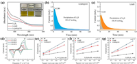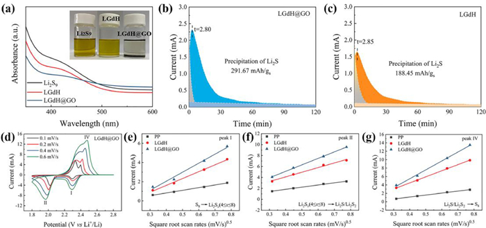 | Fig. 5. (a) Ultraviolet (UV)-visible spectra of Li2S9 solution mixed with various samples. The inset is a digital image of polysulfides (Li2S9) adsorption test after 24 h. Potentiostatic discharge profiles of Li2S8 solution on (b) LGdH@GO and (c) LGdH at 2.05 V. (d) CV curves of Li-S battery with LGdH@GO modified separator at various scan rates. Plots of peak current for (e) the first cathodic reduction process, (f) second cathodic reduction process, and (g) anodic oxidation process with the square root of the scan rate (v1/2) of the Li-S batteries with PP separator, LGdH and LGdH@GO modified separators. | |