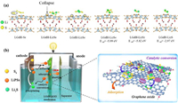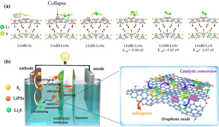 | Fig. 6. (a) Relaxed configurations of S8, Li2S8, Li2S6, Li2S4, Li2S2 and Li2S on LGdH surface. (b) Schematic illustration of the catalytic conversion mechanism of LiPSs on LGdH@GO surface. | |