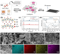 Here, we report a novel LGdH@GO modified polypropylene (PP) separator that exploit a new catalytic combination for Li-S batteries. Specifically, layered gadolinium hydroxy chlorides [Gd2(OH)5(H2O)n]Cl nanoplates (LGdH NPs) were synthesized under controllable strategies in order to catalyze the LiPSs conversion, while GO acted as a sulfur immobilizer, which endowed better cell performance with enhanced utilization of active material, improved reaction kinetics and rate capability. The LGdH@GO modified separators delivered an excellent discharging capacity of 1039 mAh/g with commercial sulfur particles at the current density of 0.2 C. Moreover, it retained a discharging capacity of 846.8 mAh/g after 100 cycles, and an excellent cycle stability with a decay rate of 0.087% over 500 cycles at 2 C. Benefiting from the first-principal calculations, the chemical evolution of each component can be examined, from which the chemical adsorption and catalytic conversion of polysulfides by LGdH@GO will be verified and studied.