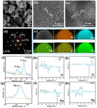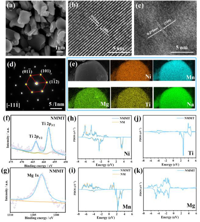 | Fig. 2. (a) SEM, (b, c) HRTEM images of the NMMT sample. (d) SAED pattern of NMMT sample. (e) Elemental mapping of NMMT sample. XPS spectra of (f) Ti and (g) Mg elements for the NMMT samples. The partial density of states (PDOS) of (h) Ni, (i) Mn, (j) Ti and (k) Mg for pristine sample and Mg/Ti co-doping sample. | |