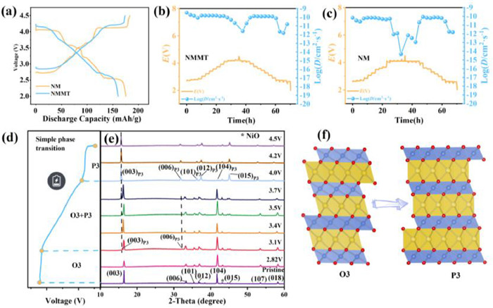 | Fig. 4. (a) Charge/discharge profiles within 2.0–4.5 V. GITT profiles and DNa for (b) NMMT and (c) NM electrode. (d) The first charge profile and (e) ex situ XRD patterns at different cut-off voltages of NMMT. (f) The structural evolution schematic for NMMT electrode. | |
