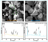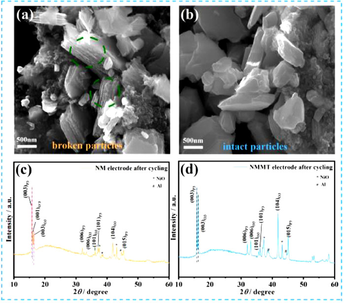| Fig. 5. The SEM images of cathode materials after cycled for 100 cycles: (a) MN and (b) MNMT. The XRD patterns of (c) NM and (d) NMMT electrodes after cycling at 0.1 C for 100 cycles in the wide voltage of 2.0–4.5 V. | |