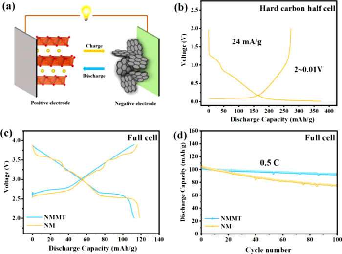 Due to the excellent structural stability of NMMT electrode, we assembled full cells to confirm the feasibility of practical application, which employed hard carbon as the anode. The schematic drawing of the full cells is shown in Fig. 6a. The hard carbon displays a reversible capacity of 273 mAh/g at 0.1 C (Fig. 6b). The full cells (NMMT/hard carbon) show a discharge capacity of 112.7 mAh/g with smooth curve within 2.0–3.9 V (118.7 mAh/g for NM) (Fig. 6c). Meanwhile, the cyclic stability is outstanding and the capacity retention is 90.8% after 100 cycles at 0.5 C (Fig. 6d), much surpassing pristine sample (71.9%), which manifests the large potential in practical applications.